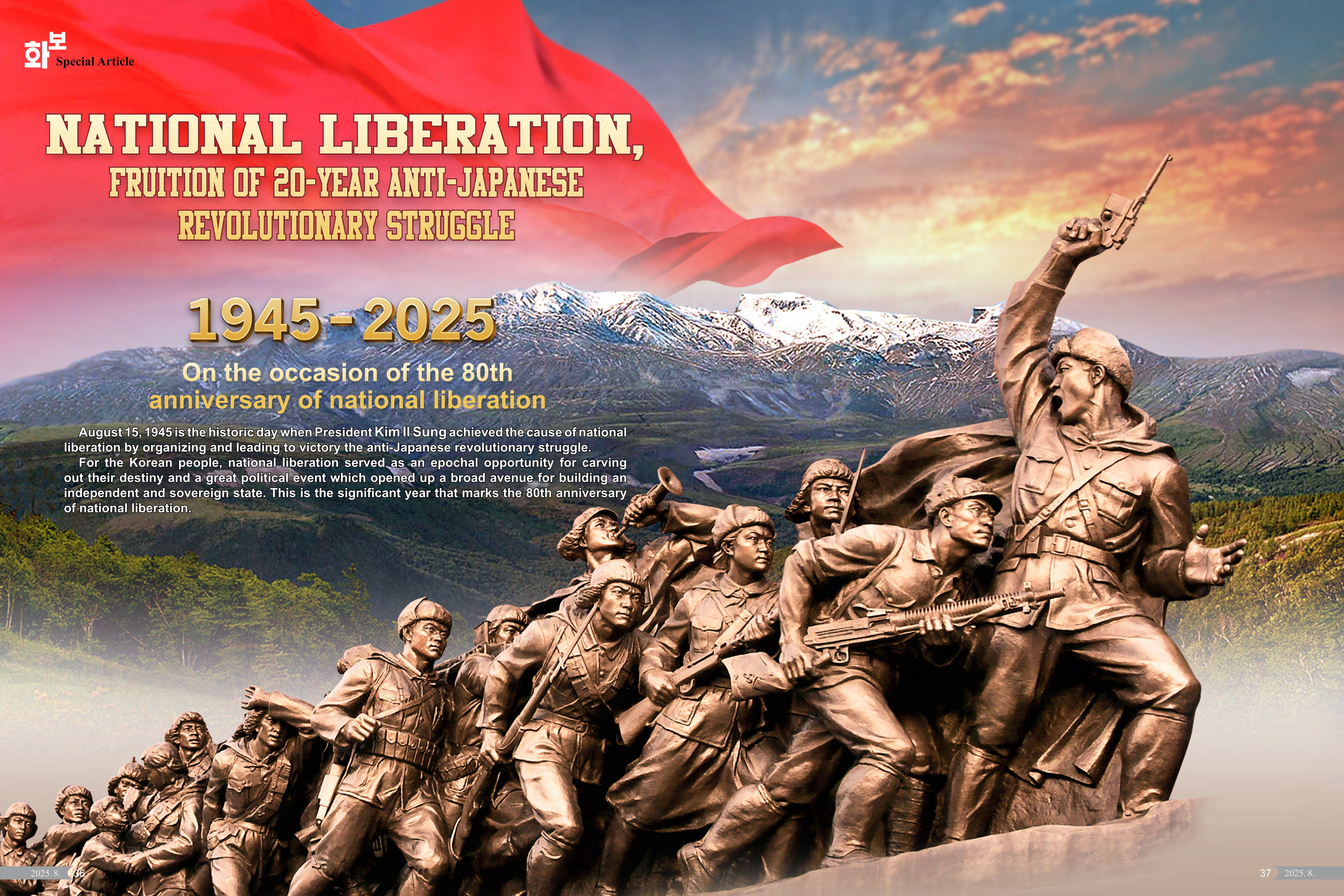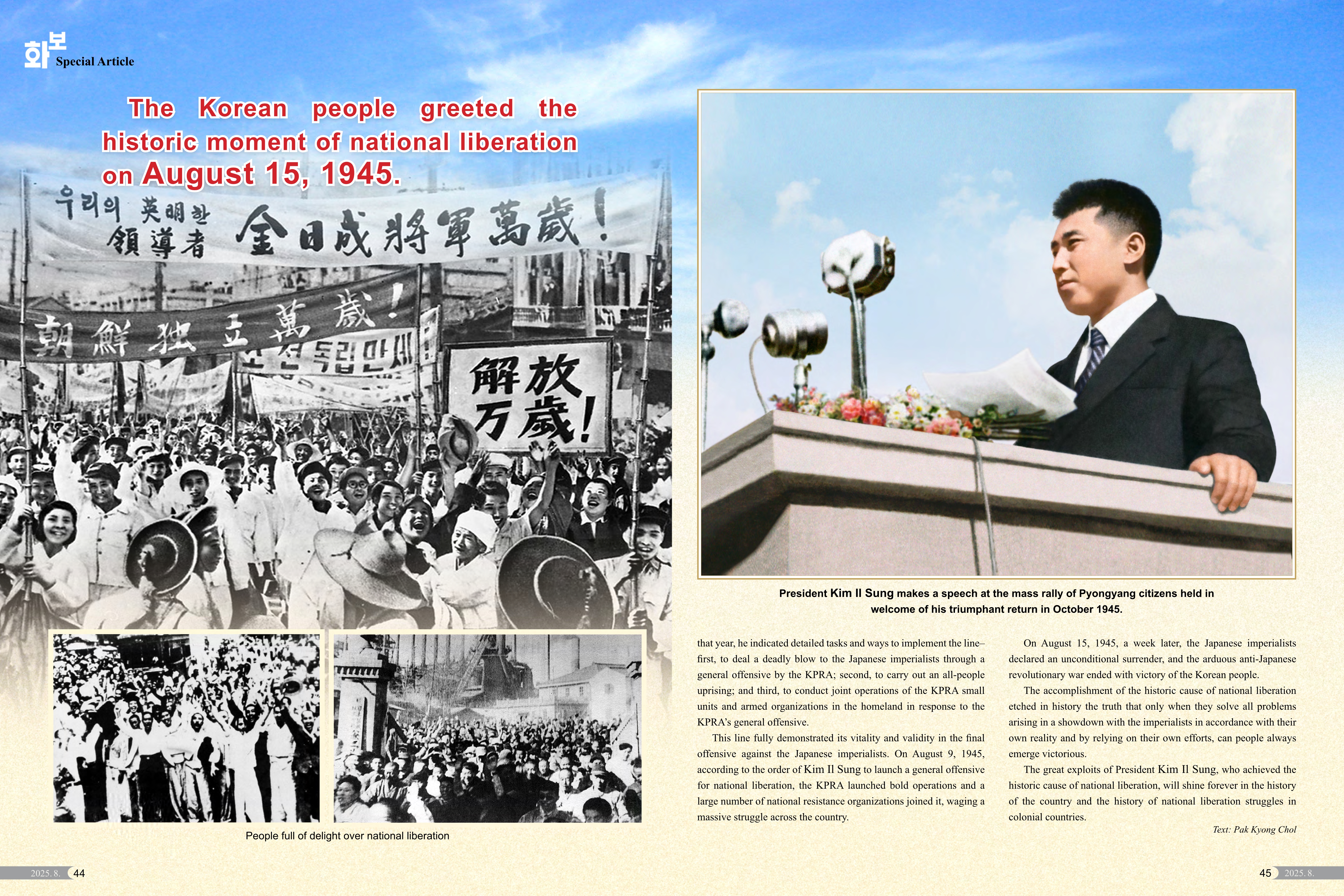 Rückblickend war die Befreiung des Vaterlandes, die durch den vom großen Führer Genossen Kim Il Sung organisierten und zum Sieg geführten antijapanischen revolutionären Kampf erreicht wurde, für unser Volk ein großes Fest und ein politisches Ereignis, das ihm einen breiten Weg zum Aufbau eines souveränen selbstständigen Staates eröffnete.