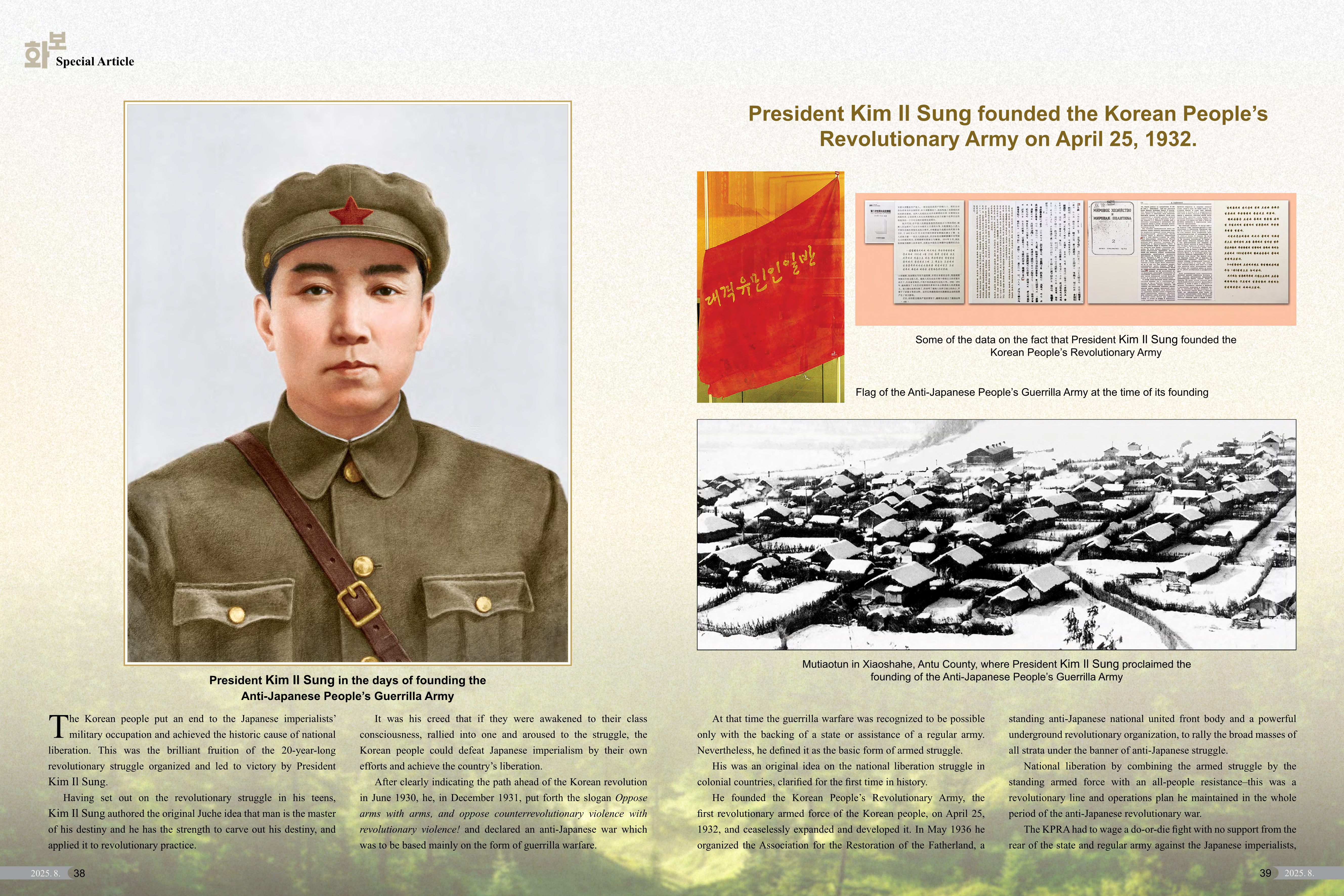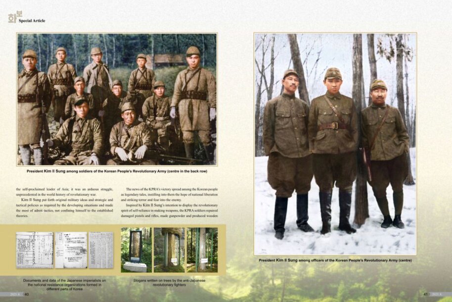 Seiner Führung folgend entfaltete die KRVA unter dem hoch erhobenen Banner der Souveränität und der Unabhängigkeit aus eigener Kraft mutig den totalen Krieg gegen den räuberischen japanischen Imperialismus. Die antijapanischen Vorkämpfer, erste Generation unserer Revolution, verehrten Kim Il Sung als Zentrum des Zusammenschlusses und der Führung und gaben mit der festen Siegeszuversicht, Korea werde unbedingt befreit, da Kim Il Sung in der Mitte sei, und dem todesmutigen Entschluss – wenn wir auch tausend Tode sterben, werden wir den Feind besiegen – für die Befreiung des Vaterlandes ihre Jugend wie auch ihr Leben selbstlos hin.