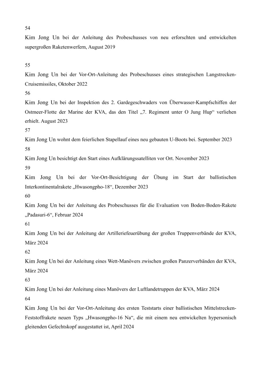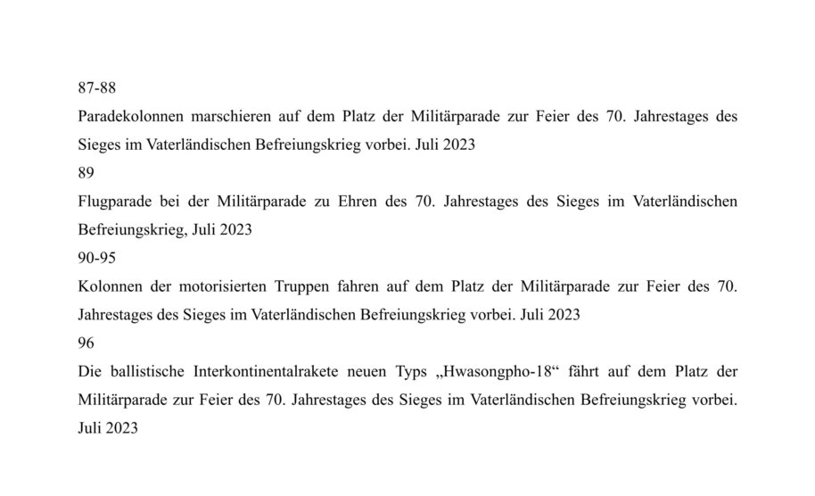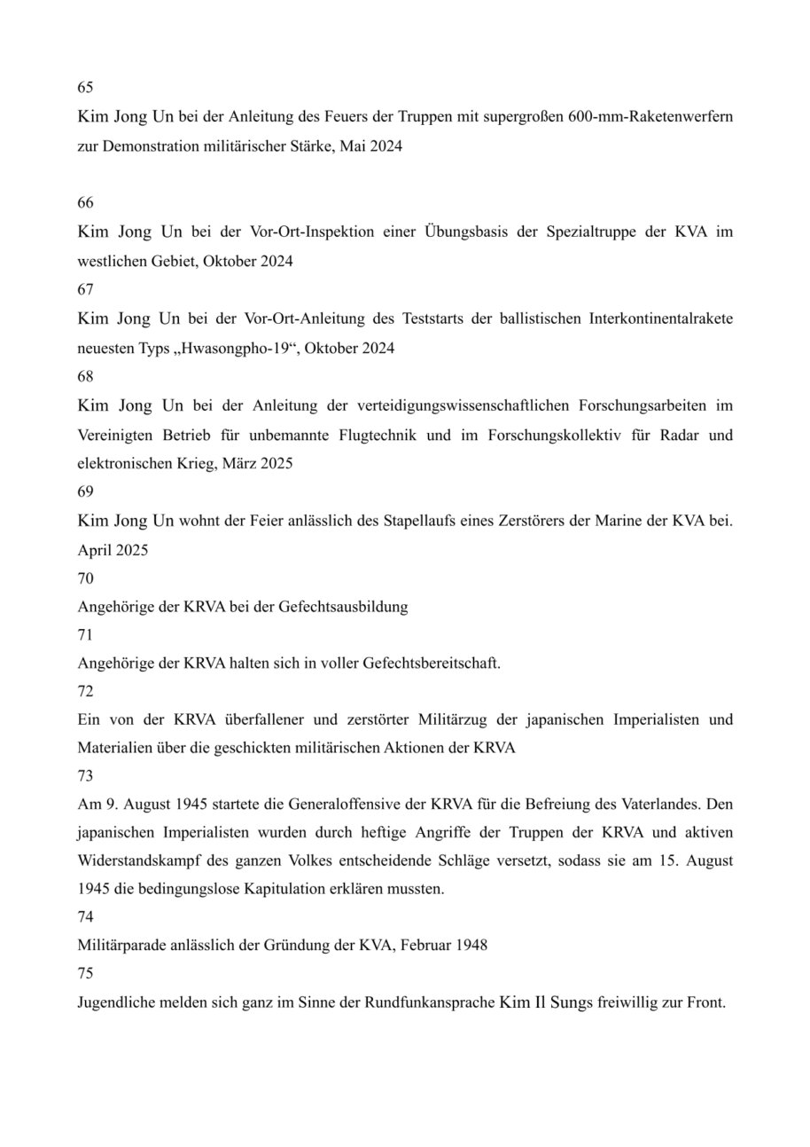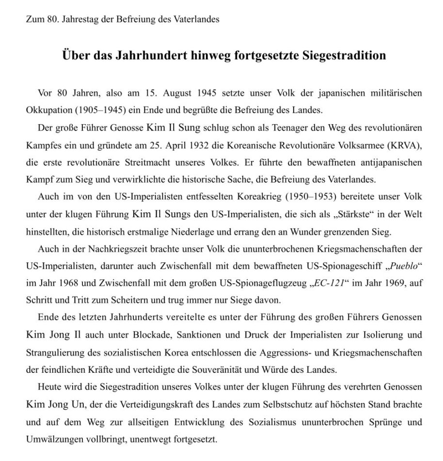 In diesem Zeitpunkt zu Ehren des 80. Jahrestags der Befreiung des Vaterlandes entbieten unser Volk und die Soldaten und Offiziere der Volksarmee die größte Hochachtung gegenüber dem großen Führer, der auf dem langen harten Weg gegen den japanischen Imperialismus das beraubte Land wiedererlangte und mit hervorragender Führungskraft und durch große revolutionäre Praxis eine ewige Grundlage für das Erstarken und Aufblühen des Vaterlandes schuf, und verpflichten sich, der Führung des verehrten Genossen Kim Jong Un folgend das koreanische revolutionäre Werk zu vollenden.