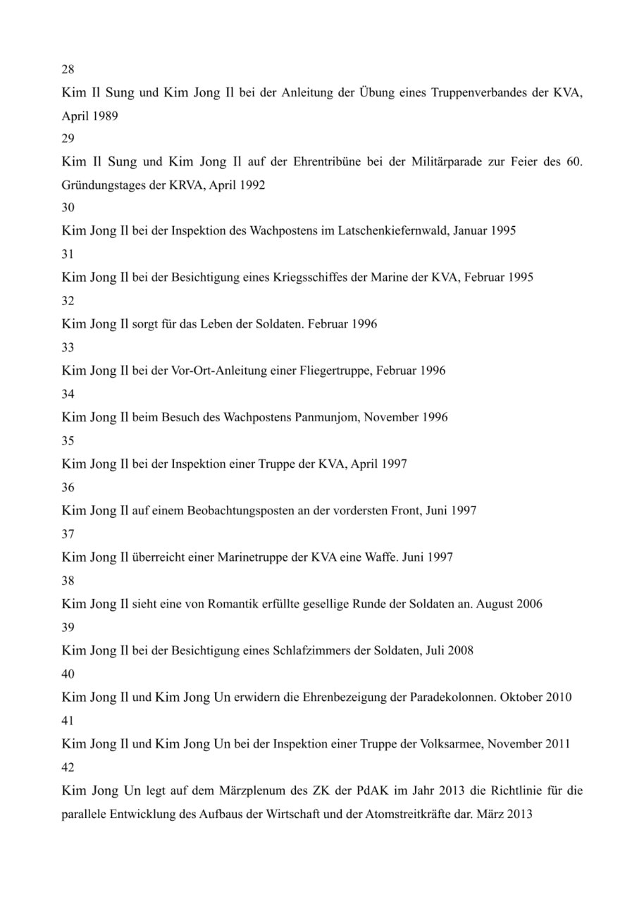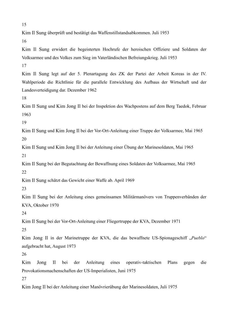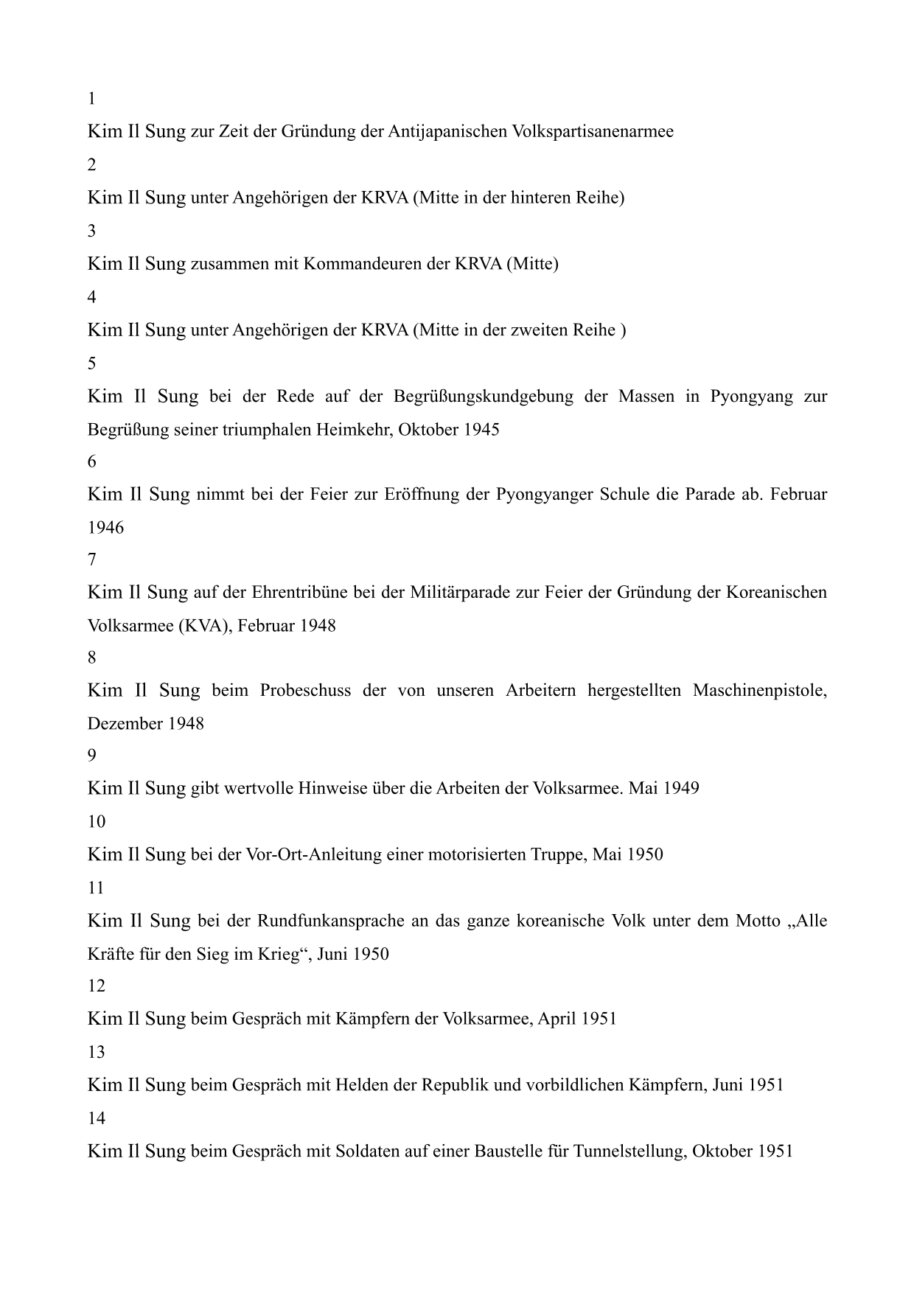 Er sagte dazu, die Einheiten der KRVA als die Hauptkraft der koreanischen Revolution zu erhalten und zu verstärken sowie ihre Soldaten und Kommandeure zu fähigen politischen und militärischen Kadern zu erziehen und damit das gesamte Volk in politisch-ideologischer Hinsicht gründlich vorzubereiten.