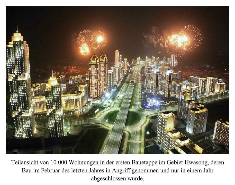 In der faszinierenden Illumination bilden die Gruppen von einzigartigen Bauten eine neue Straße. Sie ist eine neue Prachtstraße in Pyongyang, Hauptstadt der DVRK. Hier fand am 16. April die Feier zur Einweihung von 10 000 Wohnungen in der ersten Bauetappe im Gebiet Hwasong statt. Daran nahmen die Werktätigen und deren Angehörige teil, die in die neuen Wohnungen einziehen werden.