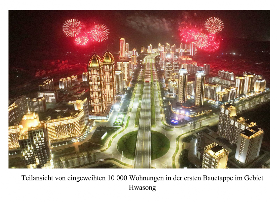 Am 16. April fand in Pyongyang, Hauptstadt der DVRK, die Feier zur Einweihung von 10 000 Wohnungen in der ersten Bauetappe im Gebiet Hwasong statt, deren Bau nach dem Bauprojekt der Partei der Arbeit Koreas (PdAK) für 50 000 Wohnungen in Pyongyang am 12. Februar 2022 in Angriff genommen wurde.