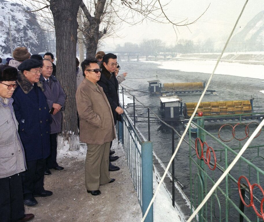 Kim Jong Il bei der Beobachtung eines schwimmenden Kraftwerkes in der Stadt Kanggye, Januar 1998