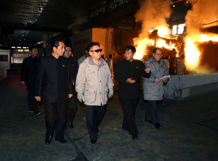 Kim Jong Il bei der Vor-Ort-Anleitung des Vereinigten Stahlwerkes Chollima, Dezember 2008
