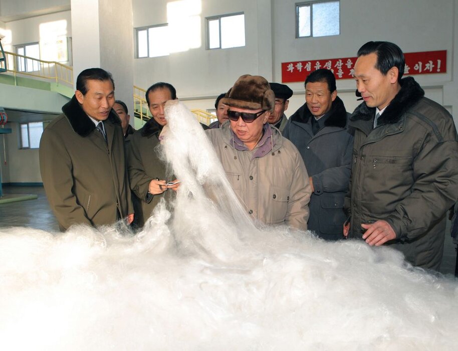 Kim Jong Il bei der Begutachtung der Vinalon-Watte im Vereinigten Vinalonwerk „8. Februar“, Januar 2011