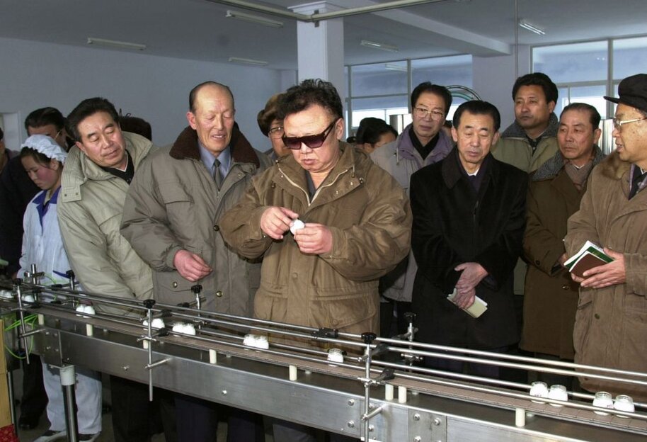 Kim Jong Il bei der Vor-Ort-Anleitung des Kosmetikbetriebes Sinuiju, Januar 2001
