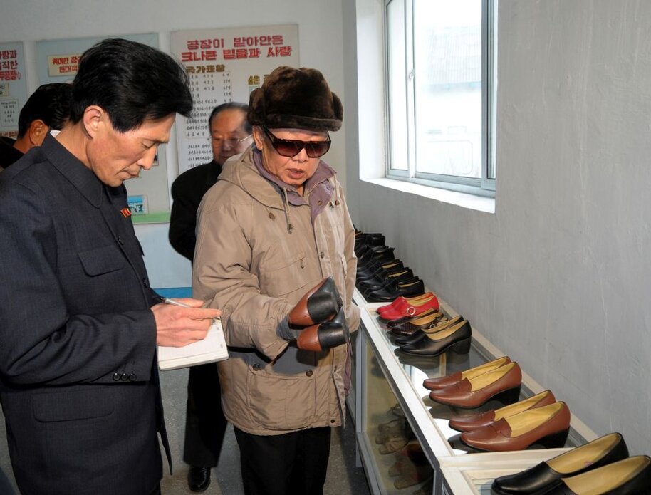 Kim Jong Il bei der Vor-Ort-Anleitung der Lederschuhfabrik Wonsan, Februar 2009
