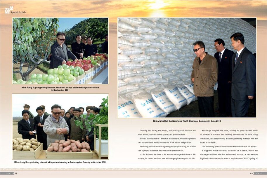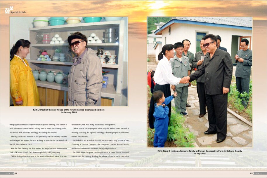 Er setzte sich zeitlebens mit aller Mühe und Seele für Aufblühen und Gedeihen des Vaterlandes ein, und seine Spuren sind in den Betrieben und Dörfern deutlich eingeprägt. Heute vollziehen sich in allen Bereichen des sozialistischen Aufbaus wirkliche Veränderungen und Entwicklungen. Diese bewundernswerte Wirklichkeit ist undenkbar, losgelöst von der von Kim Jong Il unter großem Aufwand gefestigten Grundlage der selbstständigen Wirtschaft.