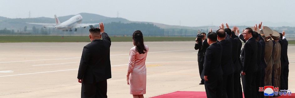 Kim Jong Un und seine Frau Ri Sol Ju winkten dieser Flugmaschine mit freundschaftlichen Sendboten chinesischer Völker nach einer Weil zu.