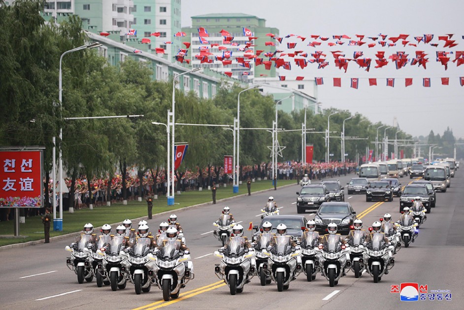 Estortiert von Motorrädern fuhr der Dienstwagen mit dem Gast nach der Unterkunft, dem Gasthaus Kumsusan, ab.