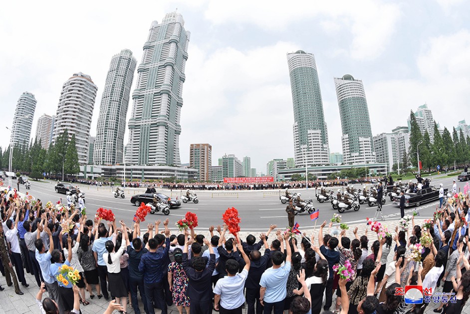 Der Gastgeber und Gast erwiderten mit der Handbewegung warmherzig die Jubelrufe der Pyongyanger.