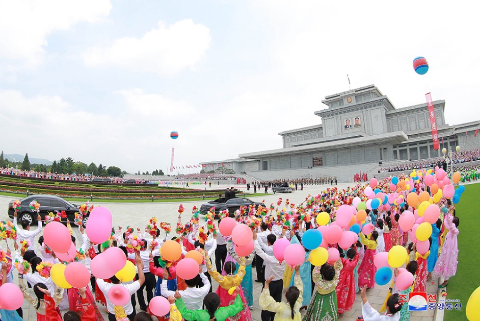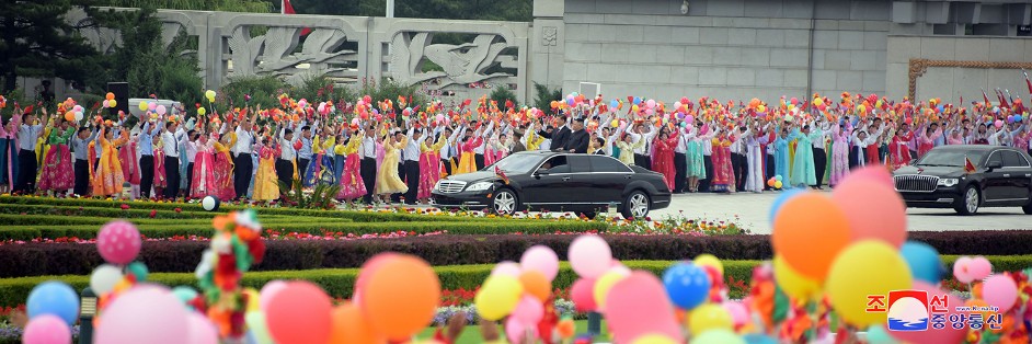 Der offene Wagen fuhr an der Ryomyong-Straße, die von den Begrüßungsmassen übererfüllt war, vorbei und erreichte den Platz des Sonnenpalastes Kumsusan.
