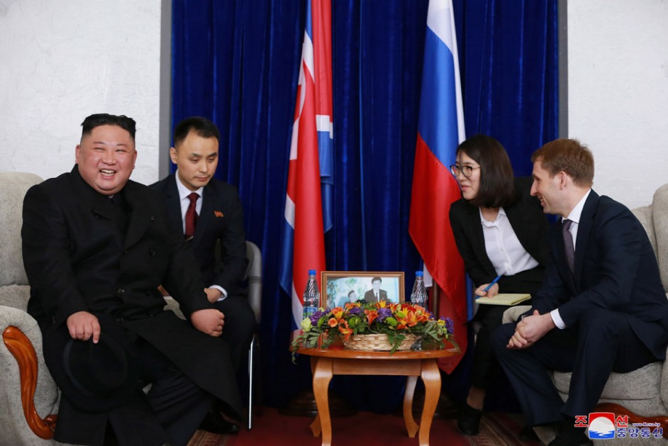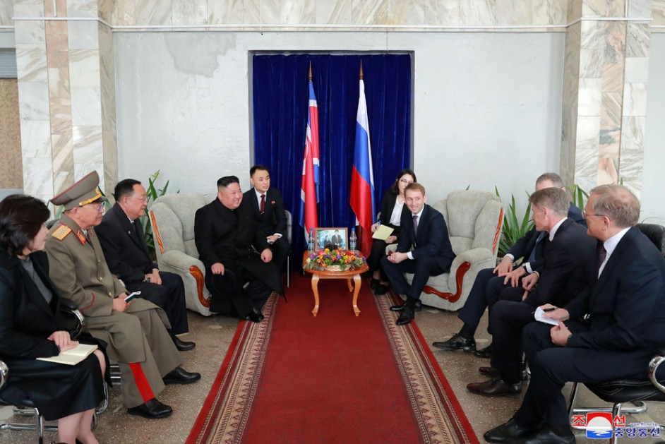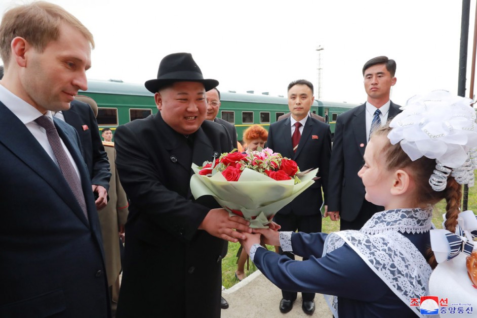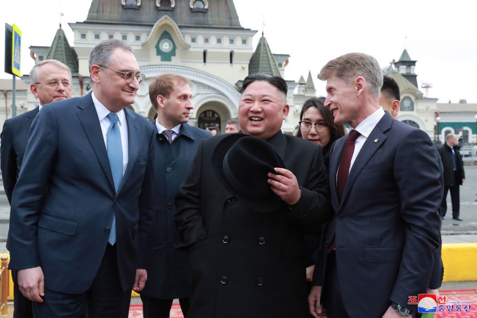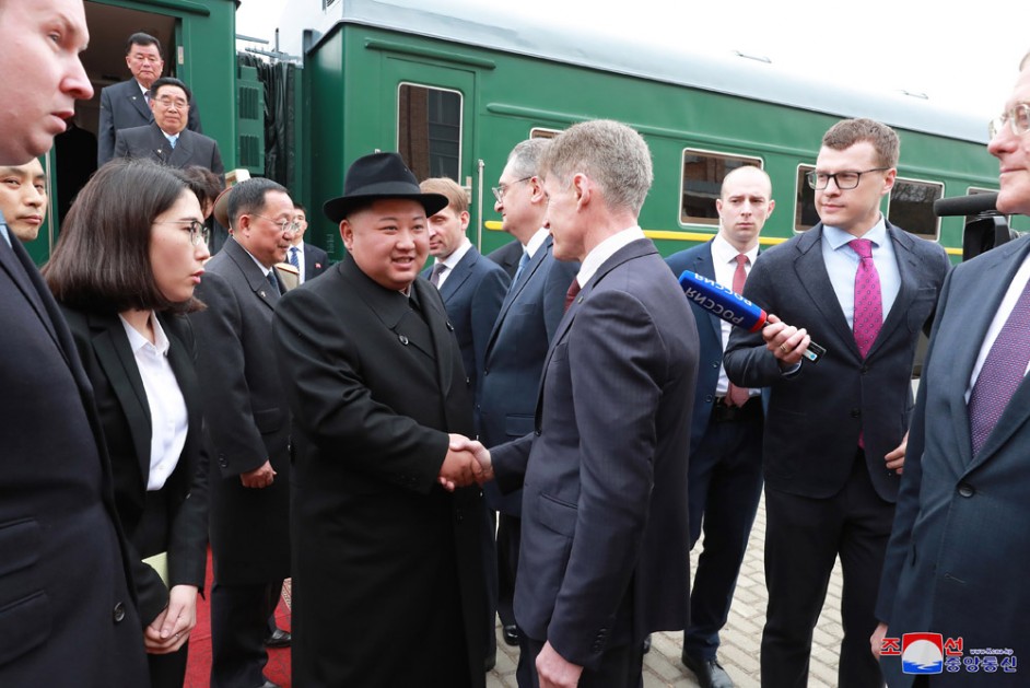 Kim Jong Un wurde am Bahnhof von Alexandr Kozlov, dem Minister vom Development für Fernen Ost und Arktik Russlands, Igor Morgulov, dem Russischen Vizeaußenminister, Oleg Kozhemyako, dem Gouverneur der Primorje-Kraien, und Alexandr Matsegora, dem Außerordentlichen und Bevollmächtigten Botschafter der Russischen Föderation in der DVRK, begrüßt.