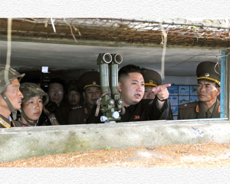 Trotz des Morgentaus bestieg er dann die Wachstelle der Front, auf die die feindlichen Gewehre und Kanonen gerichtet sind. Dort sagte er mit Nachdruck, die Soldaten sollten in höchster Alarmbereitschaft sein, damit sie zu jeder Zeit Artilleriefeuer geben könnten, wenn er den Befehl erteile, und die Feinde schonungslos vernichten, wenn diese leichtsinnig angreifen. An demselben Tag besuchte Kim Jong Un auch die Schutztruppe des Helden der Insel Mudo. Er erkundigte sich dort in allen Einzelheiten nach dem Dienst und Leben der Soldaten, die sich stets in voller Kampfbereitschaft hielten. Er hob hervor, dieses Gebiet sei das gefährlichste Wassergebiet auf der koreanischen Halbinsel und zugleich eine sehr empfindliche Zone, die die Aufmerksamkeit der ganzen Welt errege. Er sprach entschieden, falls die Feinde auf das Territorium der DVRK selbst eine einzige Kugel schießen würden, sollten sich die Soldaten nicht auf einen Lokalkrieg an der Südwestfront beschränken, sondern zu einem heiligen Krieg für die Wiedervereinigung des Vaterlandes übergehen. Unter dem Banner des Songun suchte er für die Verteidigung der Heimat alle Orte auf, darunter die Insel Wolnae, Panmunjom und die Wachposten des Gipfels Kachil auf dem Berg Osong.