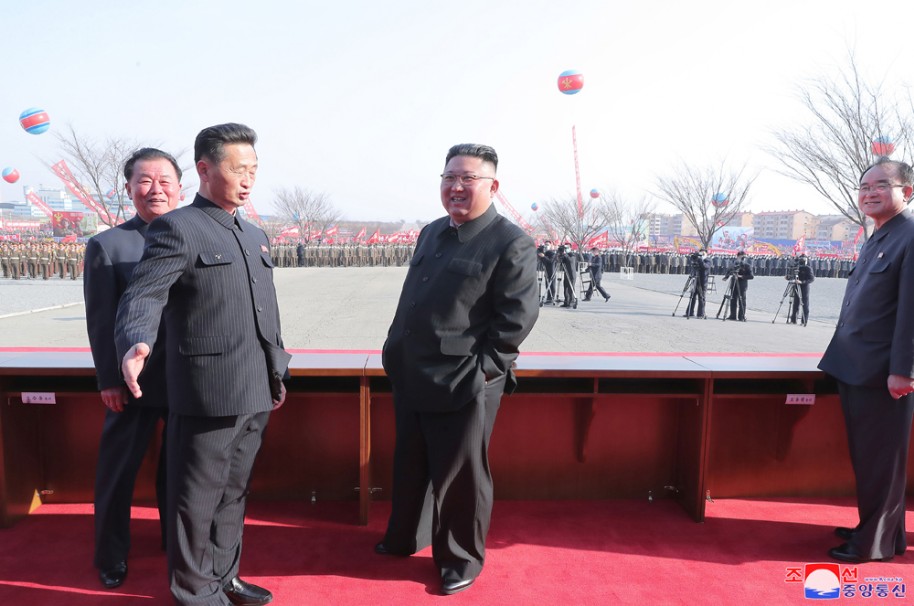 Kim Jong Un übergab persönlich den Kommandeuren die Fahne des Kommandostabes für den Bau der 50 000 Wohnungen.