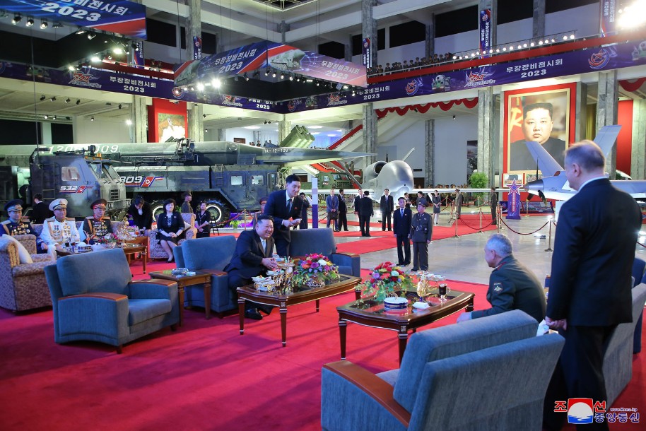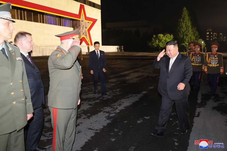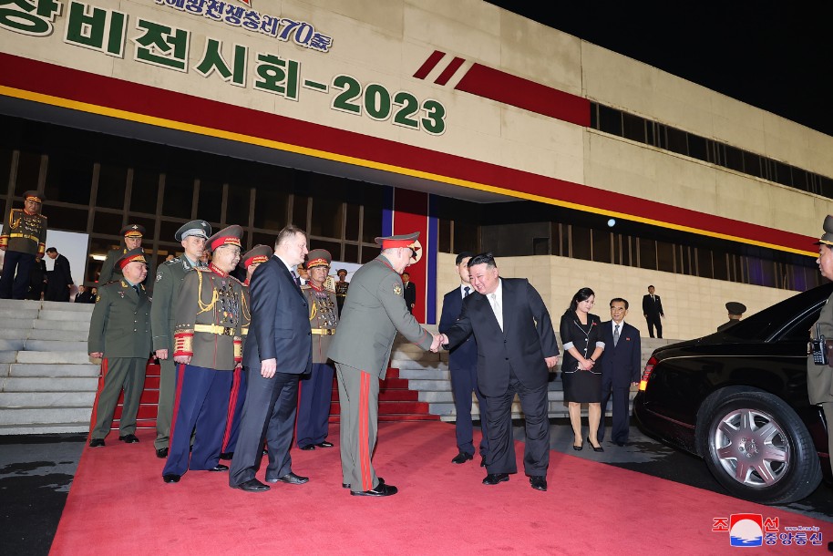 Der hoch verehrte Genosse Kim Jong Un, Generalsekretär der PdAK und Vorsitzender für Staatsangelegenheiten der DVRK, besuchte am 26. Juli mit Sergei Shoigu, dem Verteidigungsminister der Russischen Föderation, und den Mitgliedern der Militärdelegation die Ausstellungshalle für Waffen und Equipment.