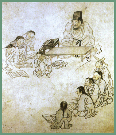 Das ist das alte Gemälde "Die private Schreibschule für Kinder", gemalt von Kim Hong Do, dem realistischen Maler Koreas zu Ende des 18. Jahrhunderts.