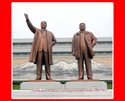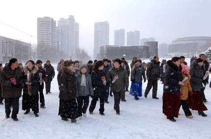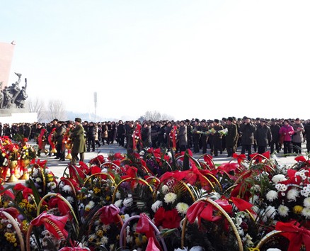 Der Hügel Mansudae wimmelte von den Leuten, die vom frühen Morgen an mit den Blumensträußen und Blumen in den Händen die Bronzestatuen vom Präsidenten Kim Il Sung, Gründer des sozialistischen Korea, und dem Heerführer Kim Jong Il, ewiger Sonne des Songun-Korea, aufsuchten.