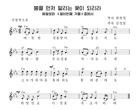 Dieses Lied ist das Themenlied "Die Blume, die den Frühling ankündigt" aus dem koreanischen Spielfilm "Der vierzehnte Winter", der im Jahr Juche 69 (1980) geschaffen wurde. Der Film zeigt die Lebensanschauung der Koreaner, die ihrem Führer sehr treuergeben sind, und die hohe Geisteswelt der wahren Menschen, die für das Vaterland und Volk ihr Ganzes einsetzen. Mit den beeindruckenden Szenen des Films hinterliess dieses Lied bei den Menschen nachhaltige Wirkung. Dass das Lied ein vom Volk beliebtes Musikstück und ein gelungenes Meisterwerk wurde, war auf die sorgfältige Leitung des Genossen Kim Jong Il mit aussergewöhnlicher musikalischer Begabung zurückzuführen. Kim Jong Il vervollkommnete das Lied zu einem Muster mit dem lebensnahen und sinnvollen Text und zu einem philosophischen Meisterwerk, indem er jeden einzelnen Ausdruck des Textes bearbeitete.