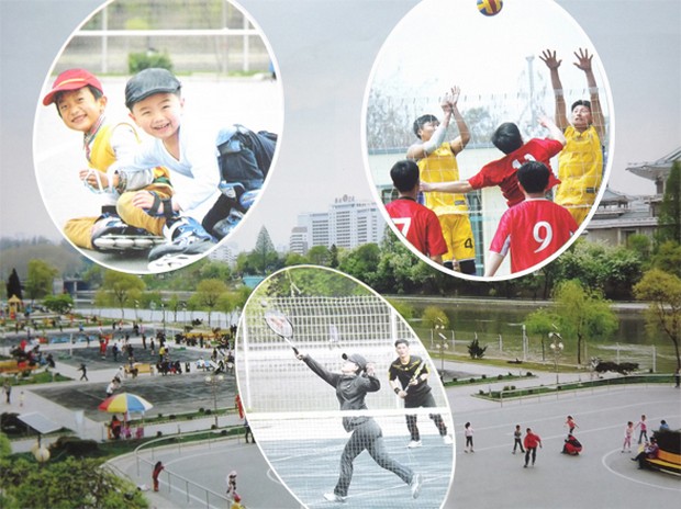 Auf den Rummelplätzen und in den Parks in Pyongyang, Hauptstadt der DVRK, verbringen die Menschen mit verschiedenen sportlichen Tätigkeiten fröhliche Stunden. Überall in der Hauptstadt wurden die Sportparks gebaut, darunter die Sportparks Pothonggang und Ansan. Sie verfügen über Spielplätze für Basketball, Volleyball, Tennis und Federball, Rollschuhbahn und über verschiedene Fitnessgeräte. Viele Werktätige, Jugendliche, Studenten und Schüler besuchen täglich die Sportparks in der Nähe der Arbeitsplätzen oder Wohnviertel. Insbesondere gibt es dort an Fest- oder Ruhetagen die Sportwettbewerbe zwischen den Kollegen, Nachbarn oder Familien. Nach Feierabend und auch jederzeit betreiben sie in den Sportparks ihren Lieblingssport und tragen wetteifernd die Wettkämpfe aus, die von vielen Menschen aufmerksam verfolgt werden. Die Basketball- und Volleyballspiele der jungen Leute, die wie die Profis geschickt dribbeln, unter dem Ring gewandt Ball werfen und mit starkem Schlag und zuverlässiger Verteidigung auf Arbeit und Landesverteidigung vorbereitet sind, sind wahrhaft hart, sodass viele Anfeuerer und Zuschauer sehr gespannt ihnen beim Spielen zusehen. Auf dem Tennisplatz schwingen die Amateure geschickt die Tennisschläger.