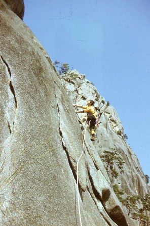 Foto rechts: Dirk Völkel bei der Erstbegehung des Ostpfeilers am Sudschonbong. Foto: Bernd Arnold, 1985