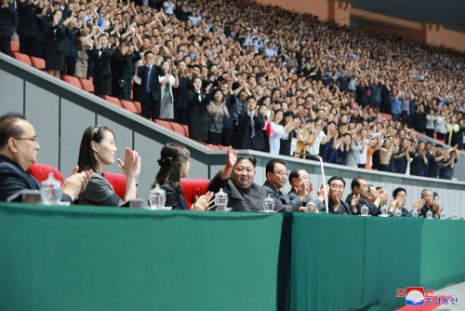 Er erschien mit seiner Frau Ri Sol Ju auf dem Zuschauerraum der Tribüne.