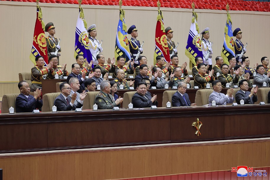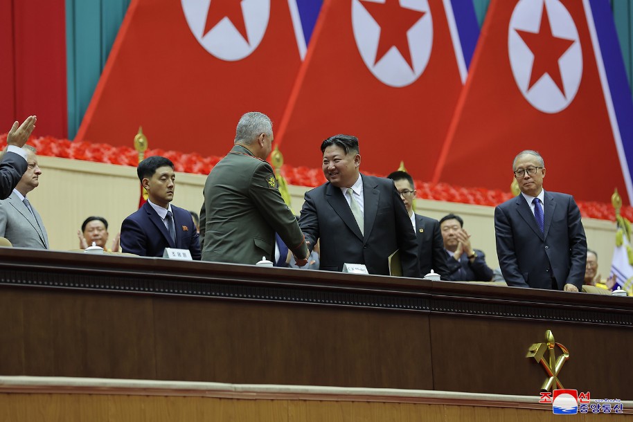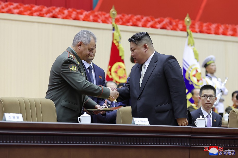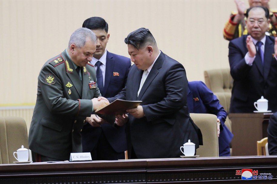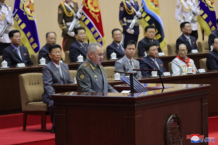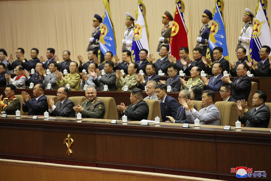 Der Redner hieß noch einmal General Sergej Schoigu, Verteidigungsminister der Russischen Föderation, des freundlichen Nachbarlandes, der zum Glückwunsch zum großen Feiertag unseres Vaterlandes zu Pyongyang kam, herzlich willkommen und erwies der Regierung, der Armee und dem Volk Russlands, welche sich zum historischen Kampf dafür erhoben haben, die Scharen, die die souveränen Rechte, die Sicherheit und die Interessen Russlands bedrohen und verletzen, zu besiegen und mächtiges Russland aufzubauen, herzlichste kämpferische Hochachtung.