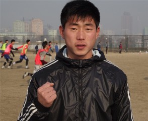 Der Fußballspieler Rim Kwang Hyok spricht: "Das Ziel von uns Sportlern ist es, Weltmeister zu werden. Voller Siegeszuversicht werden wir noch schneller und höher Sprünge machen und stolze Weltmeister werden."