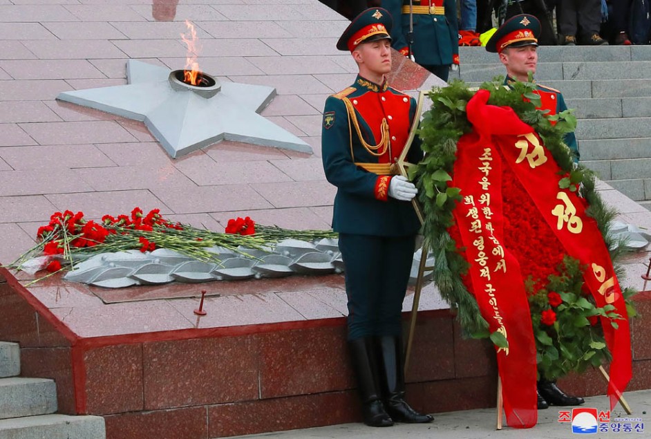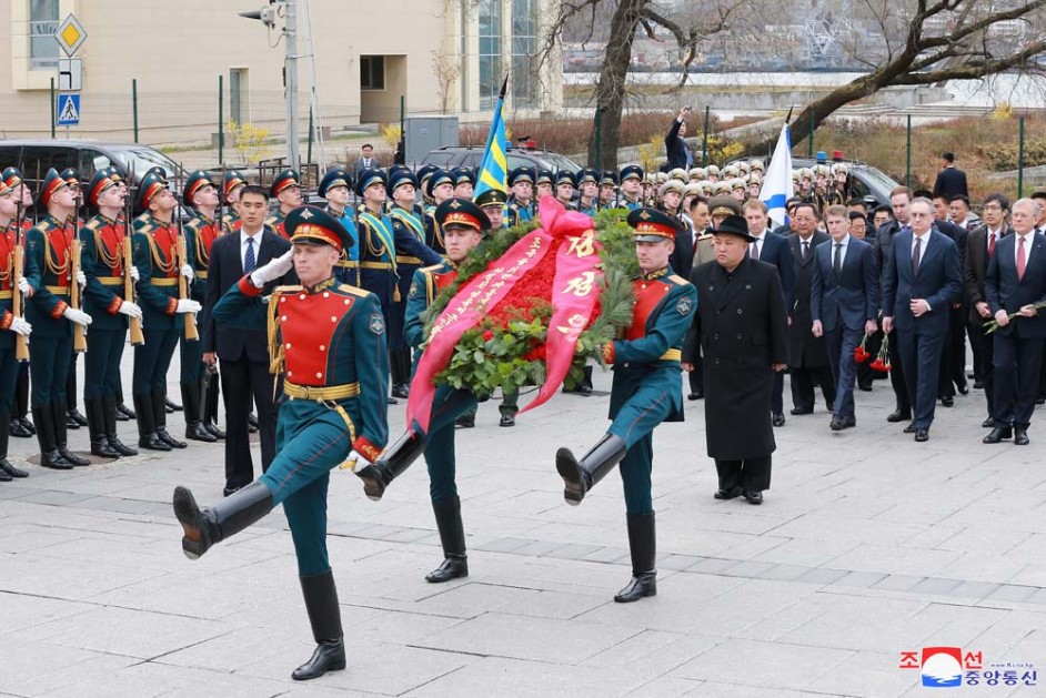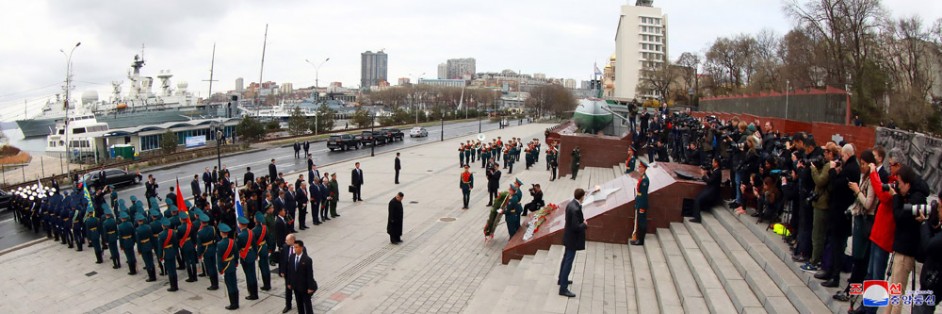 Kim Jong Un, Vorsitzender der PdAK, Vorsitzender des Komitees für Staatsangelegenheiten der DVR Korea und Oberster Befehlshaber der Streitkräfte der DVR Korea, legte am 26. April einen Kranz am Schlachtehrenmal pazifischer Flotte nieder.