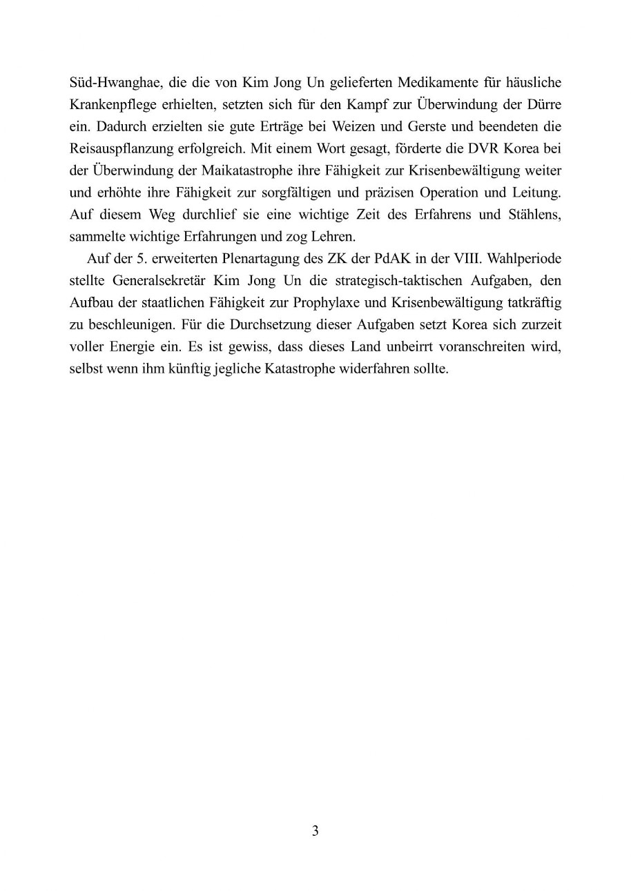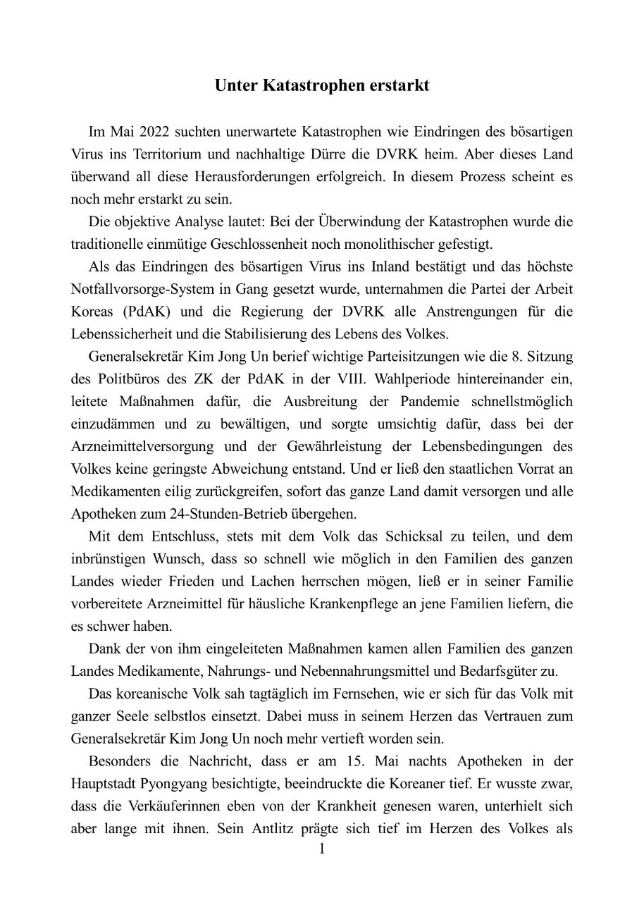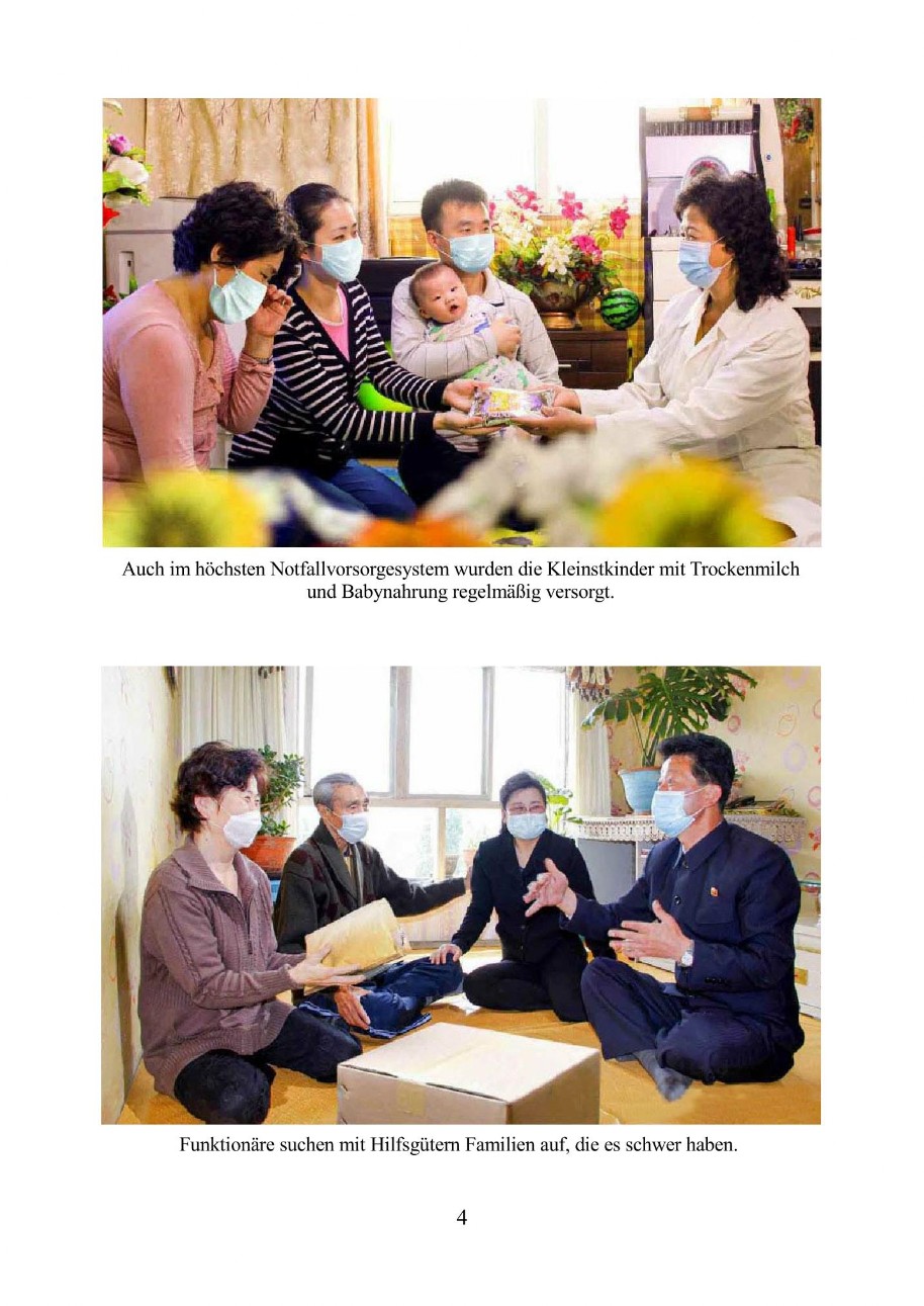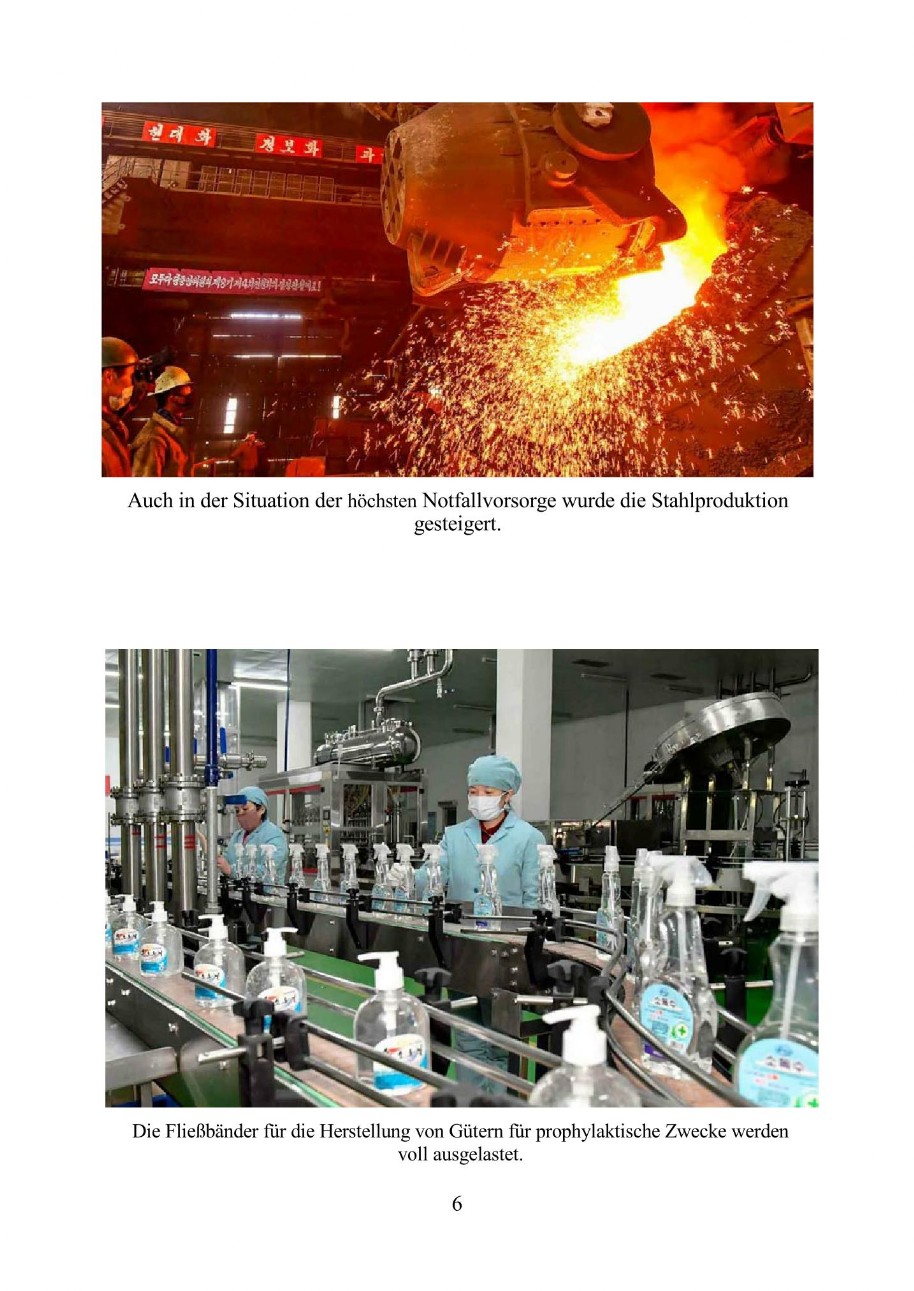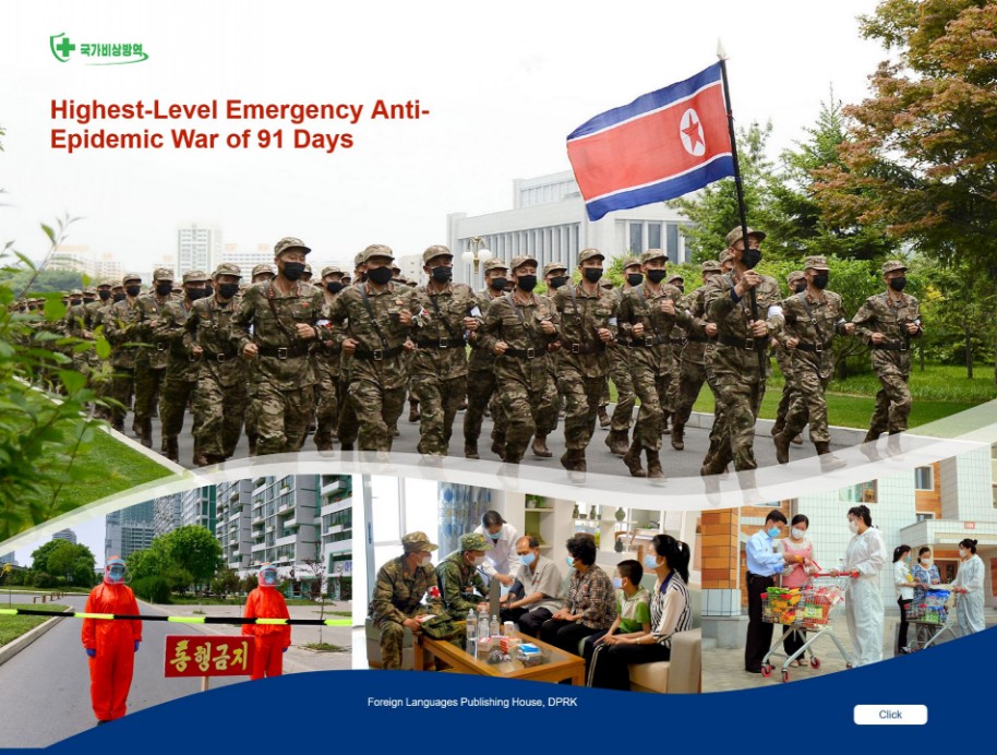 Als im Mai ins unsere Landesinnere das bösartige Virus eingeführt wurde, gab es niemanden, die vor den erstmaligen großen Unruhen nach der Staatsgründung nicht verlegt waren. Aber unser Staat setzte sofort das höchste Notfallvorsorgesystem in Gang, ergriff rechtzeitige und günstigste Maßnahmen dazu, die Krise zu überwinden, darunter Verwaltung der Ausbreitung der Pandemie, Versperrung der Ursachen der Ausbreitung und Stabilisierung des Lebens des Volkes, und entfaltete todesmutigen Kampf und erzielte in kurzer Zeit den großen Sieg im Kampf der höchsten Notfallvorsorge.