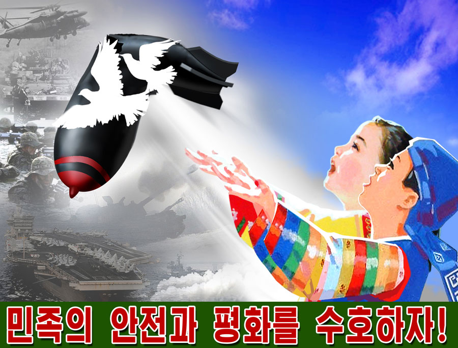 Posters "Let us resolutely check and foil confrontation and war moves of bellicose forces at home and abroad!" and "Let's defend national security and peace!" represent the spirit of the Korean people to resolutely frustrate the moves of the U.S. imperialists and the south Korean puppet group to stifle the DPRK and bring earlier the independent reunification. (1/2014)