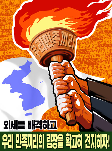 Posters "Let us respect and sincerely implement joint declarations from the firm stand of By Our Nation Itself!" and "Let us reject foreign forces and steadfastly preserve the stand of By Our Nation Itself!" show the firm will of Koreans to achieve national reunification without fail in line with the three principles of national reunification and north-south joint declarations.