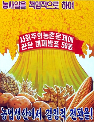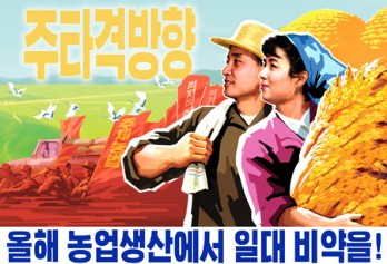A poster "Let us bring about great surge in agricultural production this year!" depicts agricultural workers full of confidence of a decisive boost in the agricultural production. It bears letters "Main thrust" with the vast field of a co-operative farm in the background.