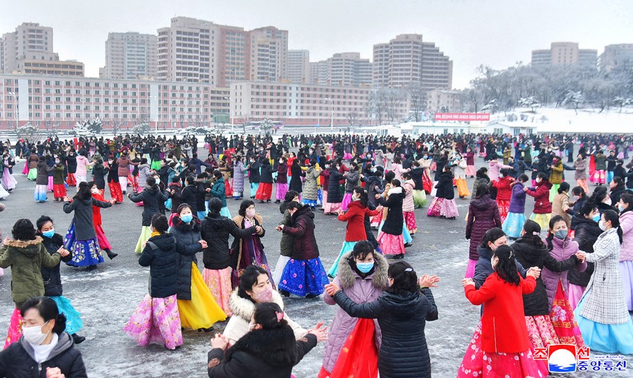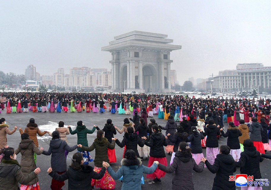 Die Tanzfestveranstaltung der Funktionärinnen und Mitglieder des Frauenbundes zum 80. Geburtstag des großen Heerführers Kim Jong Il fand am 14. Februar auf dem Platz des Triumphbogens statt.