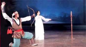 Scene 5 represents through a hunting dance the wisdom and courage of young men of Pyongyang.