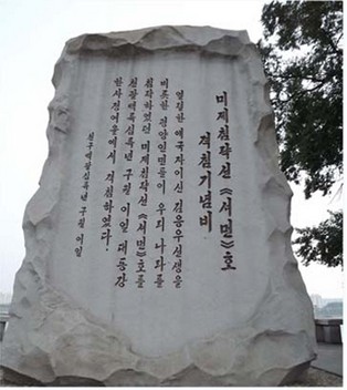 Am Ufer des Flusses Taedonggang in Pyongyang, der Hauptstadt der Demokratischen Volksrepublik Korea, steht der Gedenkstein über die Versenkung des amerikanischen Invasionsschiffes "General Sherman". Dieser Gedenkstein klagt den wahren verbrecherischen Charakter der USA an, die schon seit langem die Aggressionspolitik gegen Korea betrieben haben, und zeigt zugleich den unbeugsamen Schneid des koreanischen Volkes, das im Kampf gegen die Aggressoren die Souveränität und Würde der Nation verteidigte.