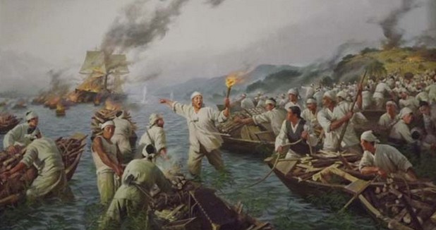 Die Angehörigen des Sturmtrupps, organisiert von Kim Ung U, begannen bei dieser Gelegenheit mit dem Feuerangriff, und zwar sie verbanden die mit Holzbündeln voll beladenen kleinen Boote miteinander, streuten Schwefel auf die Boote, legten an denen Feuer an und liessen diese vom Oberlauf zum Schiff "General Sherman" flußabwärts herunterfahren.