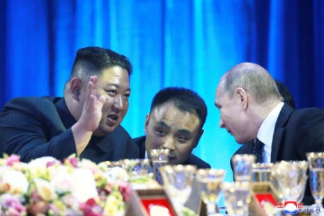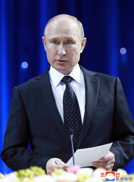 Zur Begrüßung Kim Jong Uns, des Vorsitzenden der PdAK, Vorsitzenden des Komitees für Staatsangelegenheiten der DVRK und Obersten Befehlshabers der Streitkräfte der DVRK, gab am 25. April W. W. Putin, Präsident der Russischen Föderation, ein feierliches Bankett.