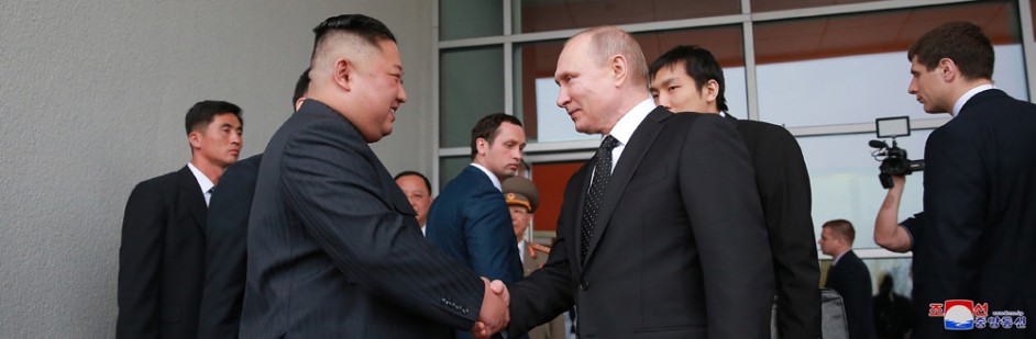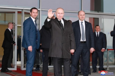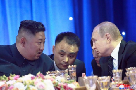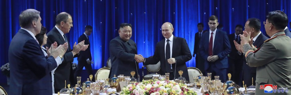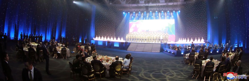 Als im Klingen der Begrüßungsmusik Kim Jong Un von W. W. Putin geführt in den Bankettsaal eintrat, hießen alle Teilnehmer den obersten Führern beider Länder, die eine neue Geschichte der koreanisch-russischen Beziehungen einleiten, mit starkem Beifall herzlich willkommen.